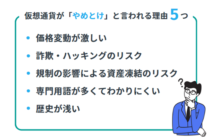 以下では、仮想通貨が「やめとけ」と言われる主な理由を詳しく解説します。