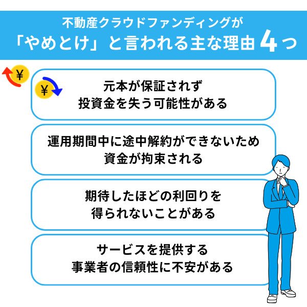 不動産クラウドファンディングが「やめとけ」と言われる主な理由は、以下の4つです。