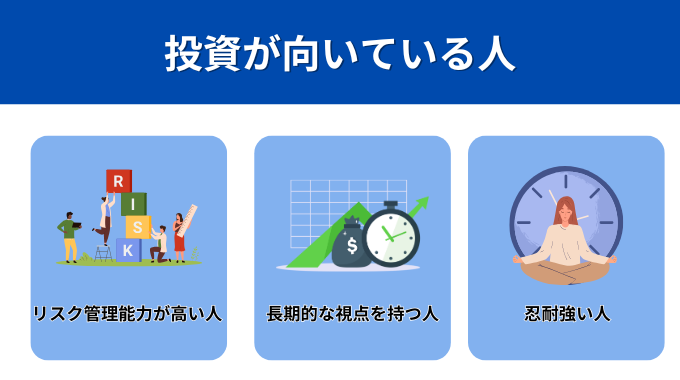 リスク管理能力が高く、長期的な視点を持ち、忍耐強い人は投資に向いています。