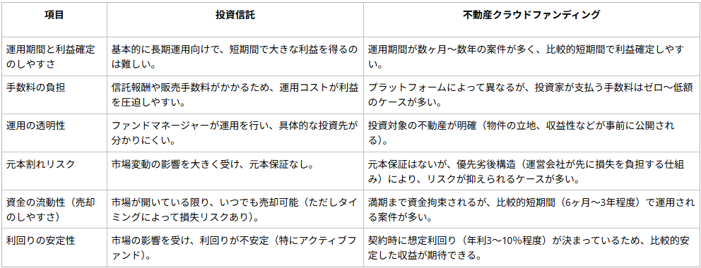 以下に、投資信託と不動産クラウドファンディングの違いをまとめました。