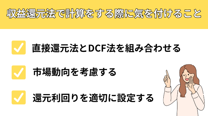 収益還元法で計算をする際に気を付けるべき点は下記の3つです。
