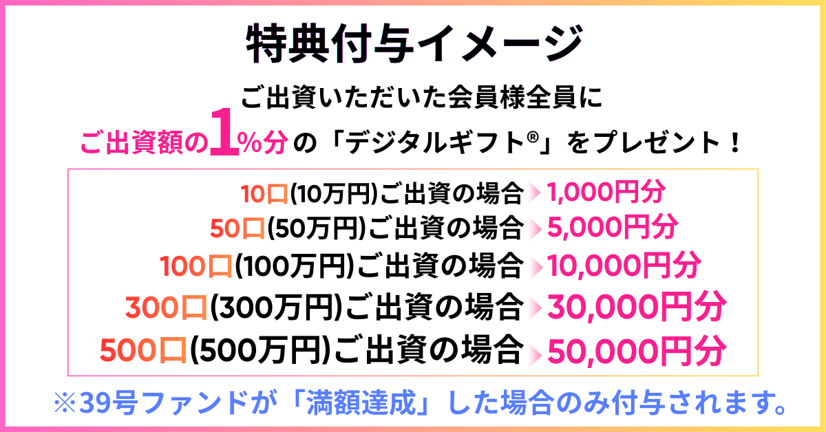 39号ファンドに10口以上ご出資いただいた方を対象に、「デジタルギフト®」をプレゼント🎁